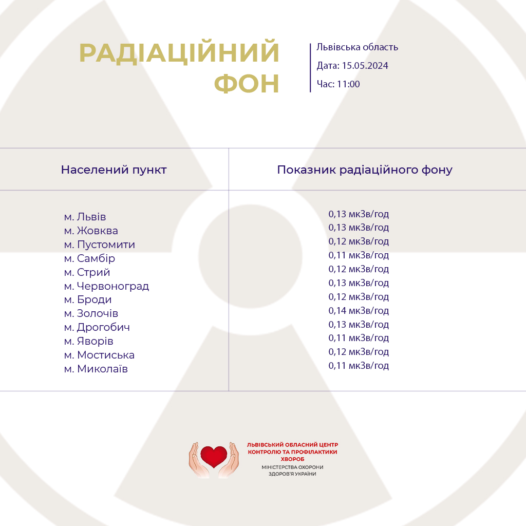 За результатами щоденного моніторингу радіаційного фону, який проводився фахівцями ДУ «Львівський обласний центр контролю та профілактики хвороб Міністерства охорони здоров’я України» у контрольних пунктах, у Львові та області перевищень рівнів природних фонових значень не відзначалося.