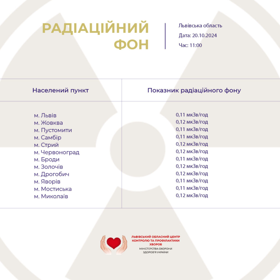 За результатами щоденного моніторингу радіаційного фону, який проводився фахівцями ДУ «Львівський обласний центр контролю та профілактики хвороб Міністерства охорони здоров’я України» у контрольних пунктах, у Львові та області перевищень рівнів природних фонових значень не відзначалося.