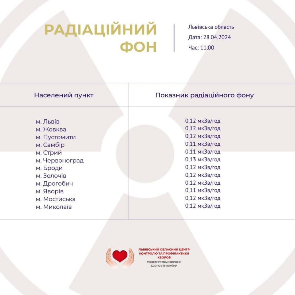За результатами щоденного моніторингу радіаційного фону, який проводився фахівцями ДУ «Львівський обласний центр контролю та профілактики хвороб Міністерства охорони здоров’я України» у контрольних пунктах, у Львові та області перевищень рівнів природних фонових значень не відзначалося.