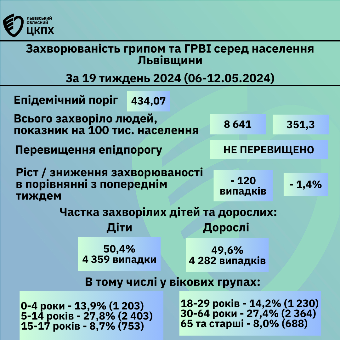 Захворюваність грипом та ГРВІ серед населення Львівщини за 19-ий тиждень 2024 (06.- 12.05.2024)