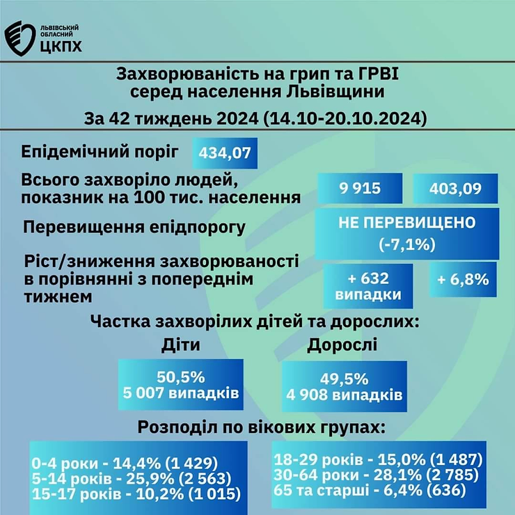 Захворюваність на грип та ГРВІ серед населення Львівщини за 42-ий тиждень 2024 (14.10 – 20.10.2024)