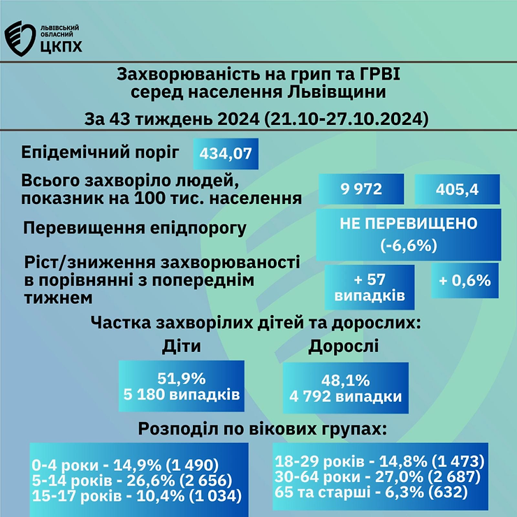 Захворюваність на грип та ГРВІ серед населення Львівщини за 43 тиждень 2024