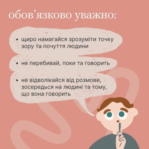 3 жовтня 2024Можливість бути почутим є чи не найважливішою підтримкою в складні часи. Але просто нагострити вуха недостатньо — ось кілька рекомендацій, як слухати інших, щоби почути головне. Зрозуміти. Дати необхідну підтримку