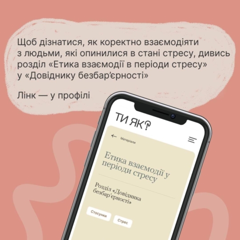 Ці рекомендації для каруселі з розділу «Етика взаємодії в періоди стресу» «Довідника безбар’єрності». Це гід із толерантної взаємодії, створений за ініціативи першої леді Олени Зеленської.