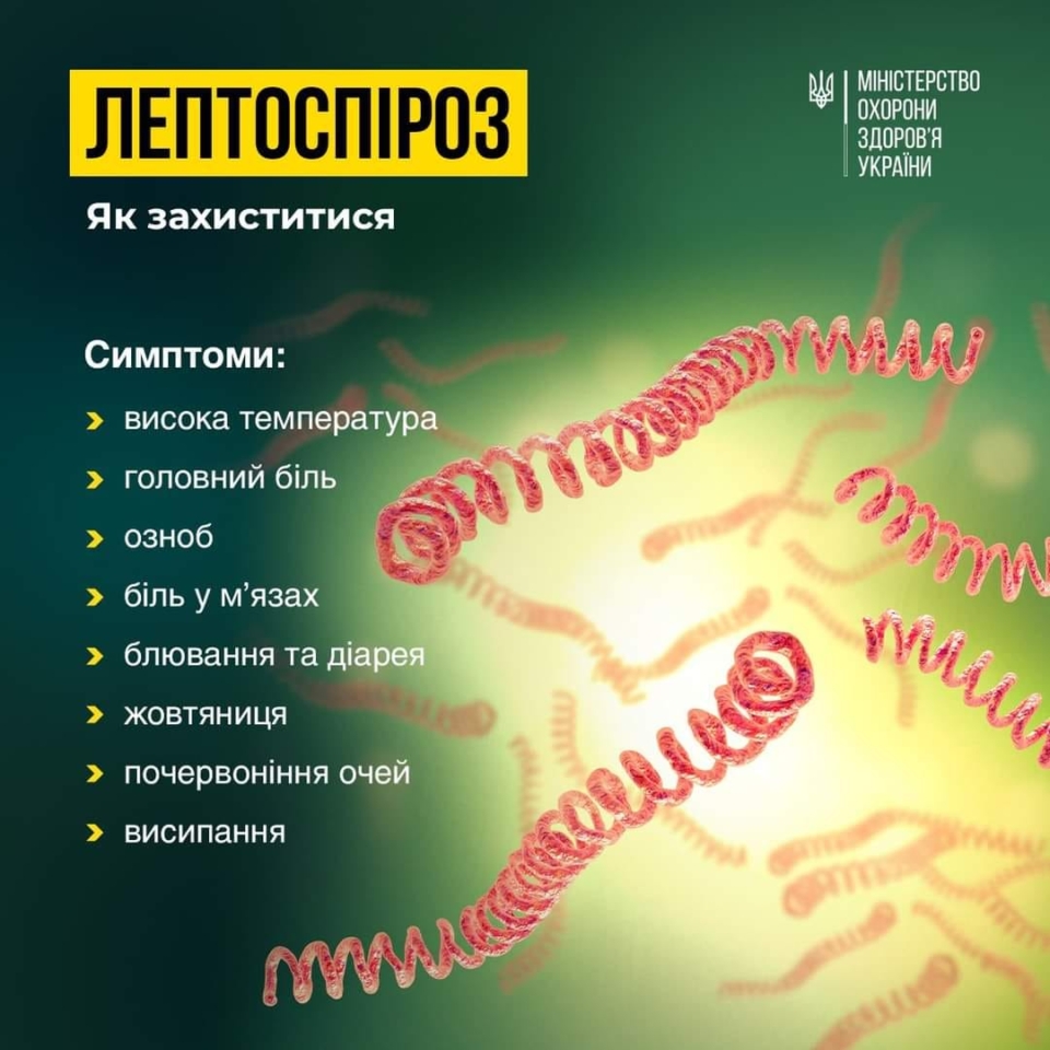 23 липня 2024Лептоспіроз – це інфекція, яка передається від тварин до людей. Бактерія проникає в організм людини через тріщини, порізи або рани на шкірі, а також через слизові оболонки очей, носа та рота.