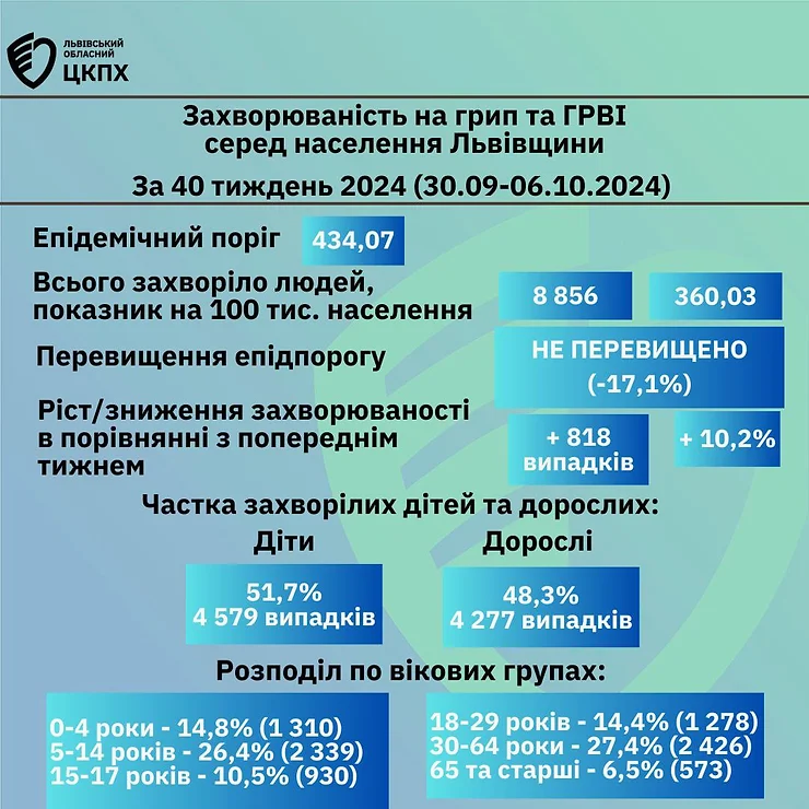 Захворюваність на грип та ГРВІ серед населення Львівщини за 40-ий тиждень 2024 (30.09 – 06.10.2024)